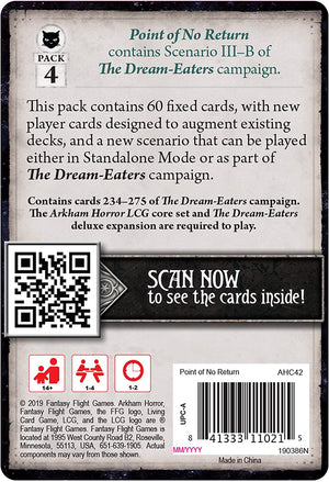 Includes 60 new cards to expand your adventures in the Arkham Horror Files universe Point of No Return is Scenario 3–B of “The Web of Dreams” campaign, which follows the path of the investigators left behind to handle the horrors of the waking world in The Dream-Eaters. Point of No Return offers you a variety of new player cards that you can equip your investigators with before they face the unknown trials of these hidden corners of the Dreamlands.