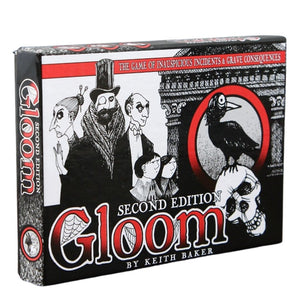 In the Gloom card game, you assume control of the fate of an eccentric family of misfits and misanthropes. The goal of the game is sad but simple: you want your characters to suffer the greatest tragedies possible before passing on to the well-deserved respite of death. Play horrible mishaps like Pursued by Poodles or Mocked by Midgets on your own characters, while trying to cheer your opponents' characters with marriages and other happy occasions. Printed on transparent plastic cards, Gloom features an innovative design by Keith Baker.