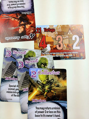 Each faction brings a different game mechanism into play – pirates move cards, zombies bring cards back from the discard pile, dinosaurs have huge power – and every combination of factions brings a different play experience. During play, base cards (each with their own difficulties and abilities) are in play. You attempt to have the most power on the base from your minions when the base is smashed.
